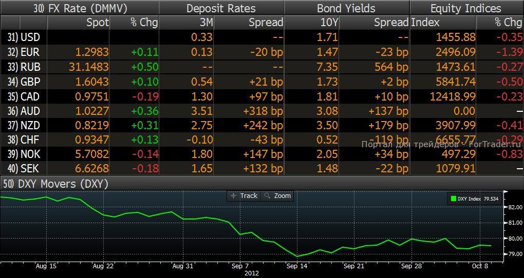 По итогам заседания Еврогруппы стало известно, об одобрении «Тройкой» действий правительства Португалии в плане снижения бюджетного дефицита. Некоторый позитив европейские инвесторы также найдут в официальном запуске механизма ESM. Сегодня в 12-30 ждем выступления главы ЕЦБ Марио Драги в Европарламенте. Важной макростатистики из Европы и Америки сегодня не выходит. Все внимание рынка будет сосредоточено на квартальном отчете алюминиевого гиганта Alcoa (ожидается, что по итогам 3 квартала компания удержится на пороге безубыточности), который выпустит релиз после завершения торгов на Уолл-стрит.