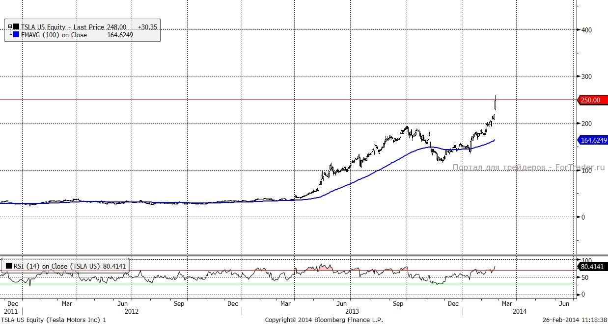 Наша цель по акциям известного производителя электрокаров Tesla Motors была побита. Ещё с конца весны мы рекомендовали покупать, тогда цена была близка к $100. Уже сегодня акции стоят чуть менее $250. На наш взгляд, сейчас длинные позиции можно начинать потихоньку закрывать.