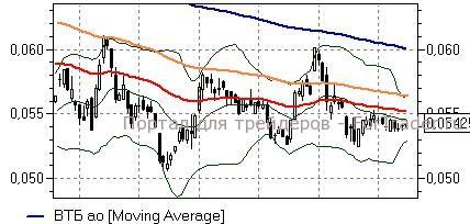 ВТБ (+0,28%) – акции уже не первый день подряд консолидируются вблизи средней полосы Боллинжера и линии EMA55 дневного графика (5,45-5,50 коп), не решаясь пойти выше. На данный момент потенциал краткосрочного роста бумаг ограничивается указанными значениями и лишь в случае их преодоления можно ожидать движения ближе к 5,64 коп (линия EMA100 и верхняя полоса Боллинжера) – торговля проходит в весьма ограниченном диапазоне значений.