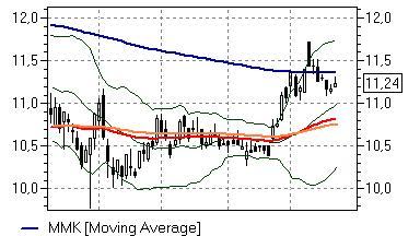 ММК (+0,71%) – акции в ходе коррекции прошлой недели приостановили снижение у средней полосы Боллинжера дневного графика (11,06 руб), в случае способности устоять выше которой можно рассчитывать как минимум на тестирование линии EMA200 (11,35 руб). Технические индикаторы при этом дают разнонаправленные сигналы, не указывая на однозначное преобладание «быков» или «медведей». Сохранение «длинных» позиций остается актуальным пока бумаги удерживают отметку 11,06 руб.