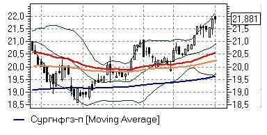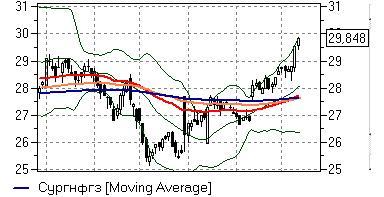 Сургутнефтегаз ао (+1,33%) – акции, несмотря на перекупленность, продолжают повышение, обновляя максимальные с сентября прошлого года значения. На данный момент, ввиду силы восходящего движения, имеет смысл удерживать «длинные» позиции, однако, неспособность бумаг устоять выше ближайшей поддержки служила бы первым сигналом начала коррекционного снижения с опасностью развития падения в район 28 руб (средняя полоса Боллинжера дневного графика).