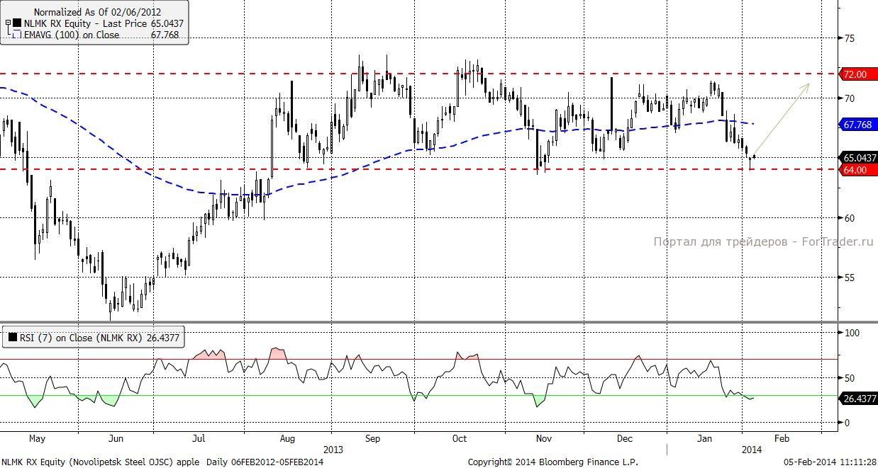 Рекомендуем обратить внимание на компании металлургической промышленности, в частности НЛМК. Ослабление рубля положительно скажется на квартальной выручке компании. Технический анализ также дает сигналы к росту. Цена движется в рамках среднесрочного диапазона 64-72 руб. за акцию и сейчас она около нижних границ. Среднесрочная цель 72 руб.