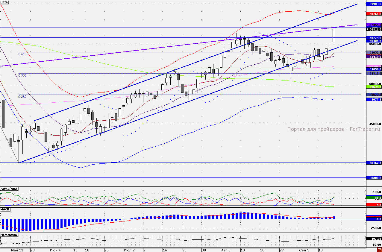 Привилегированные акции «Транснефти» сегодня снизу вверх тестируют линию долгосрочного восходящего тренда на уровне 57000 руб., действовавшего с марта 2009 по май текущего года. Вероятность преодоления данной отметки достаточно велика. Индикатор ADMI/ADX показывает, что силы «быков» по бумагам преобладают (линия «быков» находится выше линии «медведей»). Рост сигнальной линии и гистограммы осциллятора MACD (12;26;9) также не исключают возможного продолжения восходящего движения акций. В случае развития позитивного сценария бумаги могут закрепиться выше важной отметки 57000 руб. В таком случае следующей целью по акциям выступит уровень 58700 руб., где проходит верхняя граница восходящего канала, в котором бумаги торгуются с середины мая текущего года. Наш 30-минутный торговый робот находится в «лонгах» удерживая длинные позиции от отметки 55200 руб. Таким образом, при закреплении акций выше уровня 57000 руб., длинные позиции по бумагам стоит наращивать.