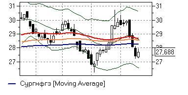 Сургутнефтегаз ао (+1,09%) – акции после преодоления на прошлой неделе района «долгих» скользящих средних дневного графика (28,3-28,7 руб) приостановили нисходящее движение, однако, в целом по-прежнему выглядят слабо и ещё имеют потенциал снижения до входа в зону перепроданности. Игрокам на повышение стоит проявлять повышенную осторожность – неспособность бумаг удержать пробитое сегодня сопротивление 27,75 руб укажет на высокие риски возобновления снижения и движения в район 26 руб (нижняя полоса Боллинжера и годовые минимумы).