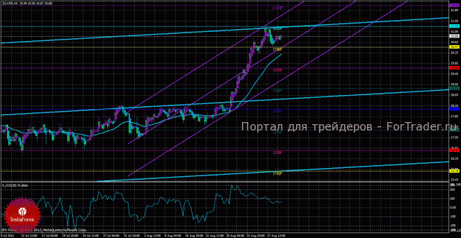 Исходя из анализа серебра 29 августа, видно, что инструмент продолжает сильное восходящее движение, коррекция получилась неглубокой и к мувингу цена не опустилась. Старший канал развернулся вбок, что свидетельствует о боковом направлении движения глобального тренда и возможном развороте канала наверх. Младший канал направлен наверх, что означает восходящее движение в менее долгосрочном плане. Сейчас цена находится выше мувинга и выше уровня Мюррея «7/8»(уровни Мюррея перерасчитались), что делает более вероятным продолжение восходящего движения. Первой целью восходящего движения является уровень Мюррея «8/8» — 31,25. В случае преодоления ценой этой отметки, следующей целью для продолжения восходящего движения будет выступать уровень Мюррея «+1/8» — 32,03. Скользящая средняя направлена вверх, а цена в свою очередь находится выше нее, что сигнализирует о текущем восходящем направлении движения. Короткие позиции можно будет вновь рассматривать, если цена закрепиться ниже мувинга и развернется вниз один из каналов линейной регрессии. Хайкен Аши окрасил последние бары в фиолетовый цвет, что сигнализирует о локальном восходящем движении, а значит, что ордера на покупку сейчас актуальны, а образование 1-2 голубых баров будет обозначать начало локальной коррекции. Индикатор CCI находится около уровня 100, что свидетельствует о небольшой перекупленности инструмента.