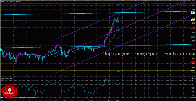 Исходя из анализа серебра 27 августа, видно, что инструмент продолжает сильное восходящее движение, преодолевая один уровень Мюррея за другим, назревает коррекция. Старший канал развернулся вбок, что свидетельствует о боковом направлении движения глобального тренда и возможном развороте канала наверх. Младший канал направлен наверх, что означает восходящее движение в менее долгосрочном плане. Сейчас цена находится выше мувинга и выше уровня Мюррея «7/8» (уровни Мюррея перерасчитались), что делает более вероятным продолжение восходящего движения. Первой целью восходящего движения является уровень Мюррея «8/8» — 31,25. В случае преодоления ценой этой отметки, следующей целью для продолжения восходящего движения будет выступать уровень Мюррея «+1/8» — 31,25. Скользящая средняя направлена вверх, а цена в свою очередь находится выше нее, что сигнализирует о текущем восходящем направлении движения. Короткие позиции можно будет вновь рассматривать, если цена закрепиться ниже мувинга и развернется вниз один из каналов линейной регрессии. Хайкен Аши окрасил последние бары в фиолетовый цвет, что сигнализирует о локальном восходящем движении, а значит ордера на покупку сейчас актуальны, а образование 1-2 голубых баров будет обозначать начало новой коррекции. Индикатор CCI находится около уровня 100, что свидетельствует о небольшой перекупленности инструмента.