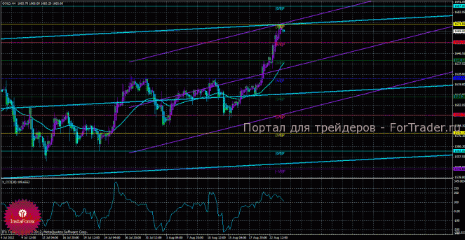 Исходя из картины, сложившейся по золоту 24 августа, видно, что инструмент продолжает находиться выше мувинга, а Хайкен Аши может развернуться вниз, а цена отскочить от уровня Мюррея «7/8». Старший канал направлен наверх, что свидетельствует о восходящем направлении движения глобального тренда. Младший канал также направлен наверх, что означает восходящее направление движения и в среднесрочном плане. На данный момент цена находится выше мувинга и выше уровня Мюррея «6/8»(все уровни Мюррея перерисовались), что говорит нам о восходящем направлении движения в ближайшей перспективе. Первой целью восходящего движения, таким образом, является уровень Мюррея «7/8» — 1671,88. В случае преодоления этого уровня следующей целью для восходящего движения станет уровень Мюррея «8/8» — 1687,50. Скользящая средняя направлена вверх, а цена находится выше нее, поэтому сейчас более вероятно восходящее движение в ближайшие дни. Хайкен Аши окрасил последние бары в фиолетовый цвет, что сигнализирует о текущем восходящем движении, поэтому лонги можно рассматривать до разворота этого индикатора вниз, что укажет на начало новой локальной коррекции. Короткие позиции станут вновь актуальными после разворота одного из каналов линейной регрессии вниз и закрепления цены ниже мувинга. Индикатор CCI находится около уровня 100, что говорит о наличие слабой перекупленности.