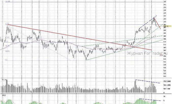 Бумаги «Газпрома» извели меня за несколько недель, пока определялись и блуждали между уровнями 200-205-210-215 рублей. В текущий момент я решила оставить все спекулятивные сделки по ним. Буду ждать выход из коридора. Если случится пробой уровня 200-199 рублей, я решусь на «шорт». Так как следующим рубежом станет поддержка 185 рублей. Сюда подтягиваются сразу несколько линий – медленная скользящая средняя ЕМА100, уровень Фибоначчи 61,8% к падению акций с октября 2009 года по май 2010 года, верхняя граница восходящего канала от июня 2010 года. Также стоит отметить, что на реальность возврата бумаг «Газпрома» к отметке 185 рублей еще намекает и дивергенция между ценой и индикатором объема торгов, а также между ценой и MACD.