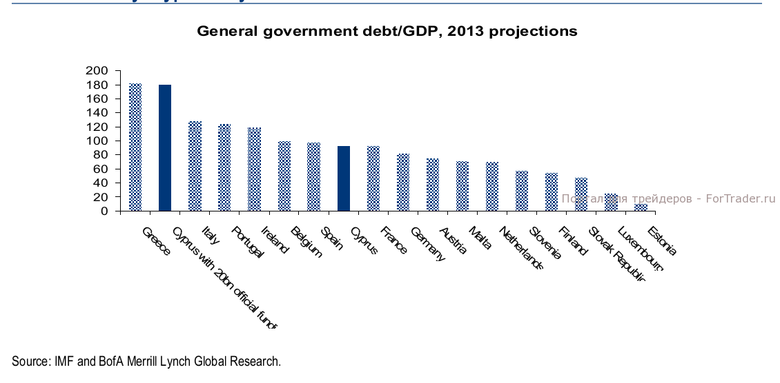 На первый взгляд, Кипр не имеет никакого значения для рынков. Его экономика составляет всего 0,15% от общего ВВП. Она третья с конца в еврозоне после Мальты и Эстонии. Казалось бы, уйдет завтра Кипр под воду – никто и не заметит, пишет BofA (кстати, любой российский чиновник или миллионер поспорил бы с этим утверждением). На небольшом кусочке суши обосновался значимый для всего мира финансовый сектор, который в восемь раз превышает ВВП страны. Кипрские банки подверглись давлению еще после банкротства Lehman Brothers и лопнувшего пузыря рынка недвижимости. Проблем добавила внутренняя рецессия. А окончательно кипрские банки добила программа помощи Греции, в рамках которой было списано более $130 млрд. Зависимость от греческих проблем остается один из основных слабых сторон банковского сектора Кипра.