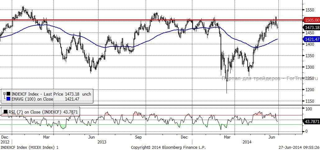 Конец месяца, конец недели и психологический уровень 1500 пунктов давят на индекс ММВБ. Высока вероятность краткосрочной коррекции.