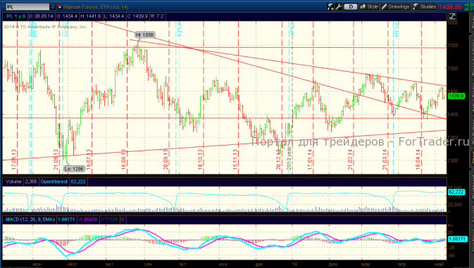Цены на платину откорректировались до уровня 1433$ под влиянием падения на рынке золота. Платина поддержана продолжением конфликта в ЮАР и растущим спросом. Ближайшие уровни поддержки в платине – 1433-1415$, уровни сопротивления 1460-1470$.