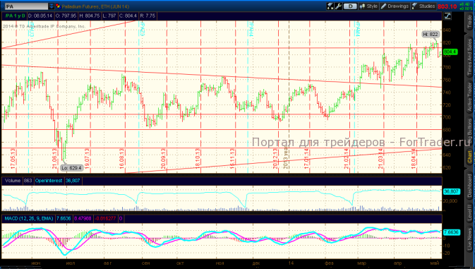 Рынок палладия под влиянием динамики прочих рынков драгоценных металлов опускался до уровня поддержки 795$, после чего вновь подрос до уровня 806$. Вероятность продолжения роста до уровня 850$ высока. Ближайшие уровни поддержки в палладии – 795-800$, уровни сопротивления 811-822$.