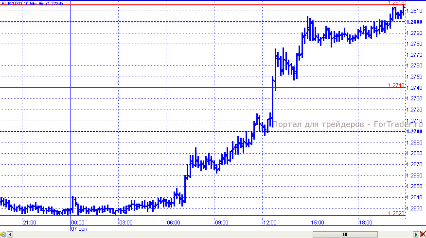 Торговые сутки в пятницу начались достаточно спокойно – пара консолидировалась в районе уровня 1,2623. Но впоследствии евро начал набирать обороты и протестировал сопротивление 1,2700. Данные по американскому рынку труда принесли негатив для доллара, чем евро и не замедлил воспользоваться. Пара прошла сопротивление на 1,2700, 1,2740 и к завершению дня зафиксировалась выше уровня 1,2800.