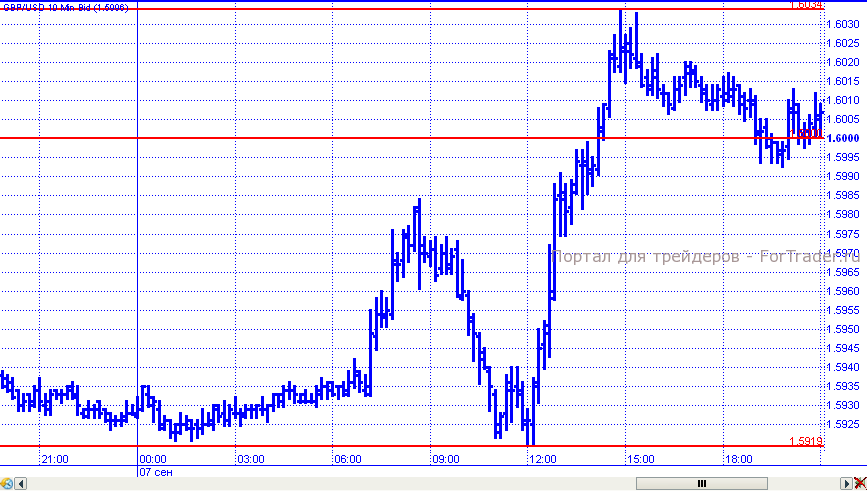 В самом начале торговых суток в пятницу цены консолидировались в пределах узкого диапазона 1,5919 – 1,5940. Н впоследствии пара смогла развить восходящее движение, хотя прежде чем ценам удалось закрепиться выше ключевого сопротивления 1,6000, они еще раз вернулись к отметке 1,5919. В течение дня пара обновила максимум на уровне 1,6034, откатившись к закрытию в район 1,6000.