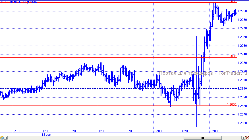 ФРС в четверг оправдал возложенные на него надежды и запустил третий раунд количественного смягчения. Вплоть до объявления решения Федрезерва пара евро/доллар удерживалась в пределах диапазона 1,2880 – 1,2936. Но в дальнейшем цены смогли преодолеть максимум текущей недели на уровне 1,2936 и продолжили подъем. Рост был сдержан уровнем сопротивления 1,3000, в районе которого пара и завершила день.
