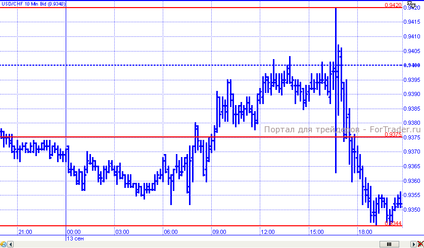 Движения пары доллар/франк носили более сдержанный характер, но швейцарец все же завершил день в небольшом плюсе против доллара. Хотя большую часть торговых суток пара постепенно двигалась вверх. Цены преодолели сопротивление 0,9375 и 0,9400. Внутридневной максимум был отмечен на уровне 0,9420. Но после объявления решения ФРС цены активно двинулись вниз и достигли уровня 0,9344.