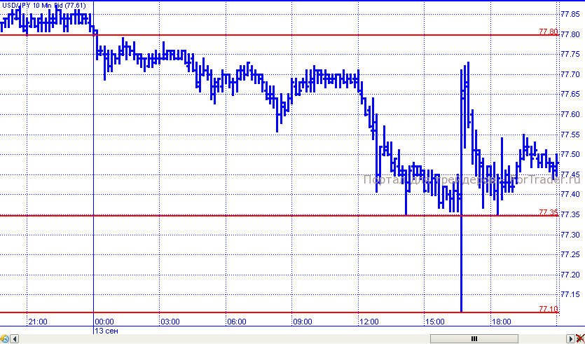 Пара доллар/иена в течение всех торговых суток постепенно двигалась вниз. От уровня 77,80 цены начали движение к поддержке 77,60, смогли закрепиться ниже нее и продолжили движение к уровню 77,35. Решение ФРС спровоцировало скачок пары к отметке 77,10, но опасения, что слишком сильный рост японской валюты вызовет вмешательство Банка Японии, вызвали столь же резкий откат. Торговые сутки доллар/иена завершил на уровне 77,45.