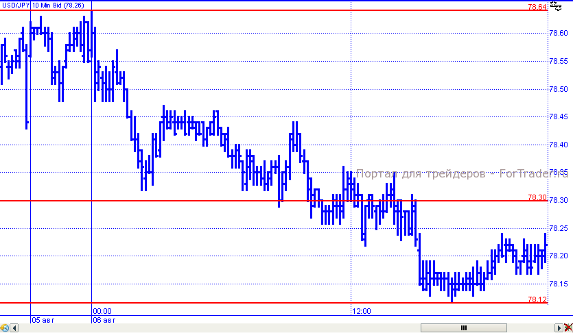 Пара доллар/иена в понедельник продемонстрировала нисходящее движение. От уровня 78,64 цены начали падение, преодолели поддержку 78,30 (хоть и не с первой попытки). Минимум торговых суток был отмечен на уровне 78.12, от которого к закрытию дня пара откатилась к отметке 78,25.