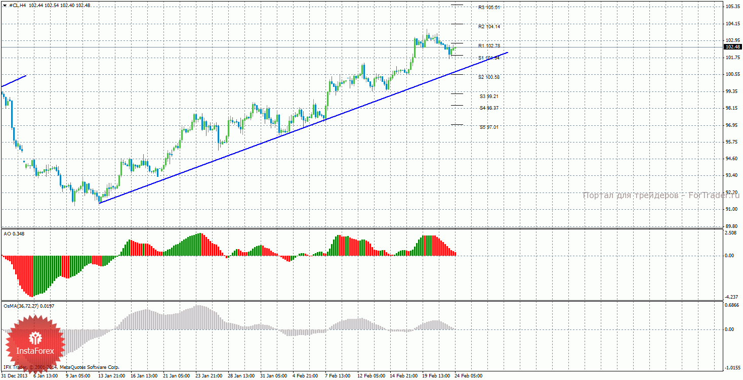 Анализ сырой нефти за 24 февраля показывает, что цена продолжает корректироваться и в начале новой недели располагается между уровнями S1 и R1. Восходящее движение может продолжиться с целями R2 – 104,14 и R3 – 105,51, если цена закрепится выше уровня 102,78. Может продолжиться нисходящая коррекция с целями 100,58 и 99,21, в случае, если цена закрепится ниже уровня 101,94. Восходящая линия тренда оказывает поддержку торгующим на повышение, цена располагается выше нее. Если цена закрепится ниже линии тренда, то тенденция на рынке поменяется на нисходящую и станут актуальными короткие позиции. Индикатор Awesome показывает текущее нисходящее движение, так как последний закрытый бар красного цвета. OsMA также направлен вниз, что говорит о нисходящем характере движения и в более долгосрочном плане. Отскок от линии тренда может спровоцировать завершение коррекционного движения.