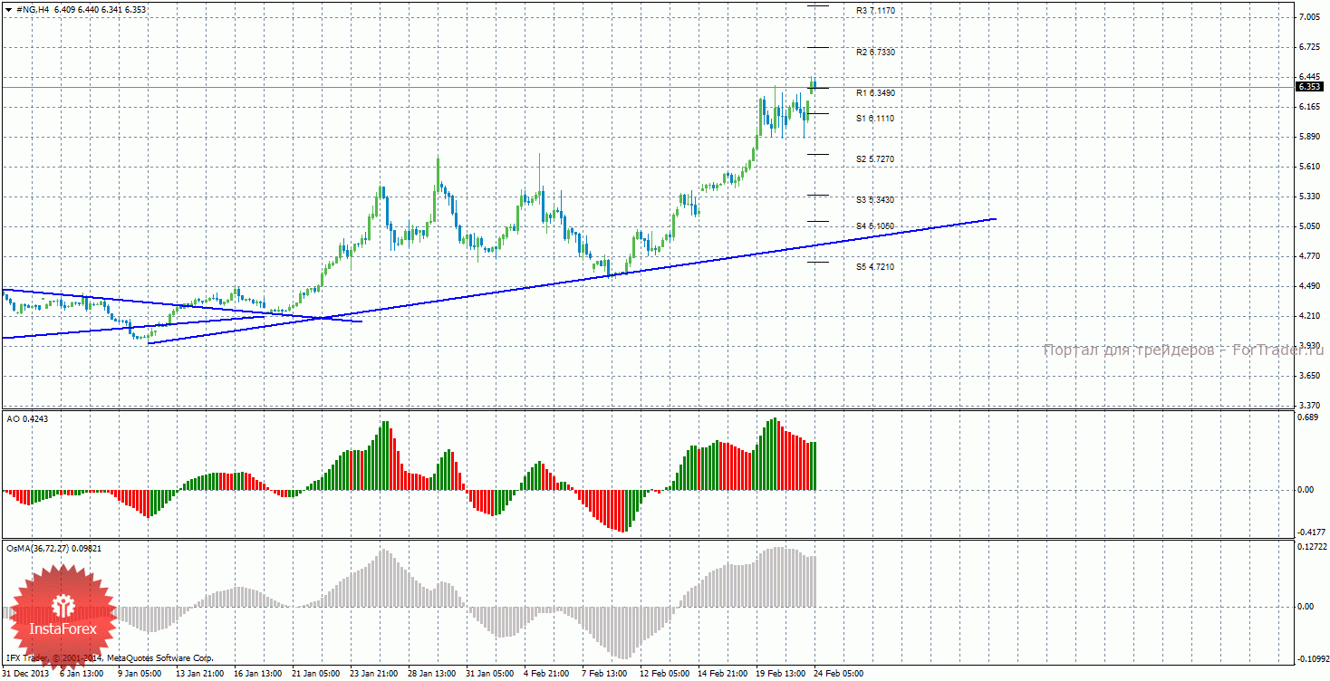 Анализ природного газа за 24 февраля показывает, что цена продолжает восходящий тренд и преодолела уровень сопротивления 6,3490. На данный момент актуально восходящее движение с целями уровни сопротивления R2 – 6,7330 и R3 – 7,1170, если цена останется выше уровня 6,3490. Целями для возможного начала нисходящей коррекции выступают уровни поддержки 6,1110 и 5,7270, если цена закрепится ниже уровня 6,3490. Восходящая линия тренда перестроена и вновь оказывает поддержку торгующим на повышение, цена располагается выше нее. Индикатор Awesome показывает локальное восходящее движение, последний закрытый бар окрашен в зеленый цвет. OsMA также развернулся наверх, что сигнализирует о восходящем движении цены на газ и в более долгосрочной перспективе. Оба индикатора могут начать разряжаться в любой момент, так как находятся на максимальных позициях. Если цена закрепится ниже уровня 6,3490, это может спровоцировать новый виток коррекции.