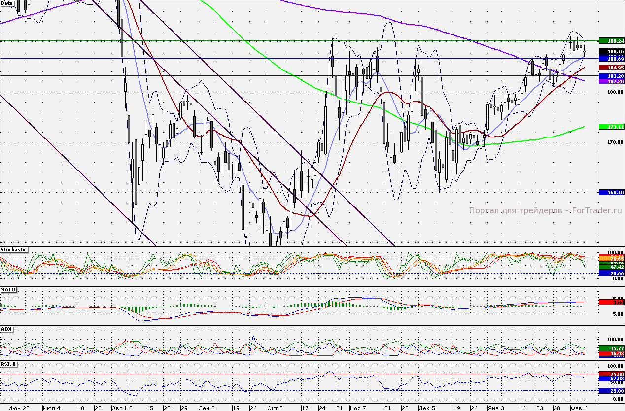 Акции компании на прошлой недели так и не преодолели отметку 190,24 руб. Данный уровень сохраняет свою стратегическую значимость: отметка 190,24 руб. является локальным максимумом, установленным во второй половине 2011 года. При пробитии данной отметки целью станет годовой максимум 2012 года — 191,11 руб. Поддержкой по бумагам остается 186,70 руб., в районе которой проходит 10-дневная скользящая средняя.
