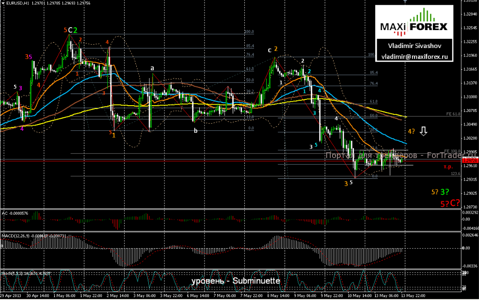Утро понедельника было свободно от значимой экономической статистики по Еврозоне, в связи с чем, евро стабилизировался в узком боковом диапазоне, ограниченном уровнями 1.2978 ÷ 1.2965. Валюта продолжала оставаться под давлением на фоне плачевных прогнозов по росту экономики ведущих стран Еврозоны. В этот раз, Банк Франции представил абсолютно слабый прогноз 2-го квартала 2013 года — на уровне 0.1%. Такой рост ВВП, в условиях низких темпов инфляции и огромного дефицита бюджета, ведёт, в долгосрочной перспективе, к неминуемому дефолту страны, что, естественно, отразилось в негативном настрое рынка по отношению к единой валюте. К тому же, на выходных днях, Марио Драги добавил негатива, подтвердив свой настрой на усиление стимулирования региональной экономики и ослабление евро. И, наконец, последнюю точку в плотном давлении рынка на единую европейскую валюту, поставил Отчёт по розничным продажам – в США, отметивший самые высокие темпы роста продаж в этом году. На этом фоне, курс пары резко пошёл вниз, протестировал уровень 1.2942, но затем, вновь, вернулся в диапазон, отрабатывая начавшуюся коррекцию к предыдущему снижению валюты.