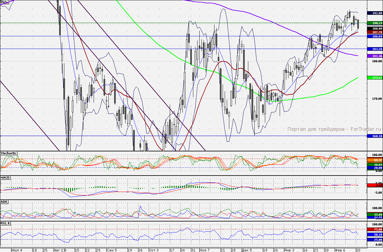Накануне акции компании устремились к 21-дневной скользящей средней – 187,78 руб. Однако достижение данной отметки сегодня не ожидается. Внешний фон улучшился, стоимость фьючерсов на нефть марки Brent вновь превышает $121 за баррель. Сопротивлением является район 190 руб., где проходит 10-дневная скользящая средняя.