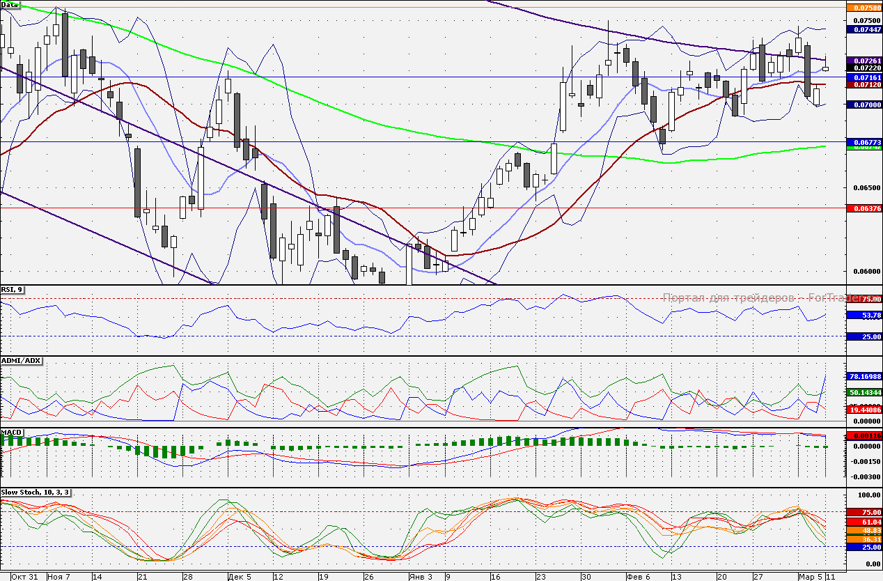 Акции банка протестировали 7,300 коп., но не пробили данный уровень. Сегодня внешний фон способствует продолжению отката вниз от данного сопротивления. Целью для снижения является 21-дневная скользящая средняя – 7,120 коп. Далее важной отметкой станет 7,091 коп. – закрытие сформированного гэпа.