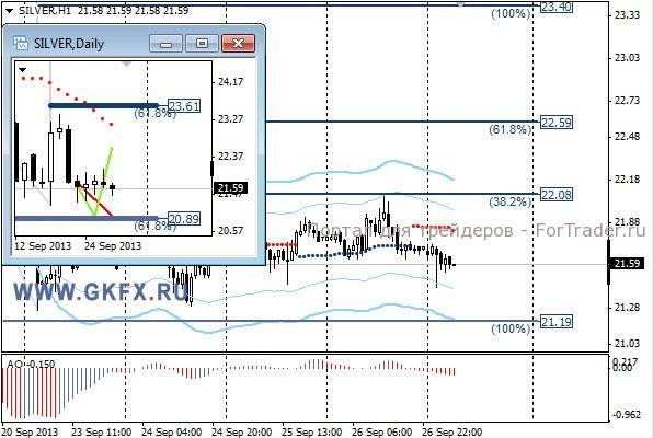 Цены на серебро продолжают торговаться в ограниченном диапазоне. Шанс на рост цен на серебро остается высок, пока цена не спустится ниже 21,19. Традиционно делаю два варианта движения цены на неделю, основной красный и альтернативный зеленый. Значимые уровни на сегодня отмечены на часовом графике. Индикатор АО находится в отрицательной зоне и снижается, указывая на желание инструмента идти вниз в данное время. Индикатор тренда указывает на снижение. Преодоление 22,10 даст возможность ценам на серебро подняться к 22,70.