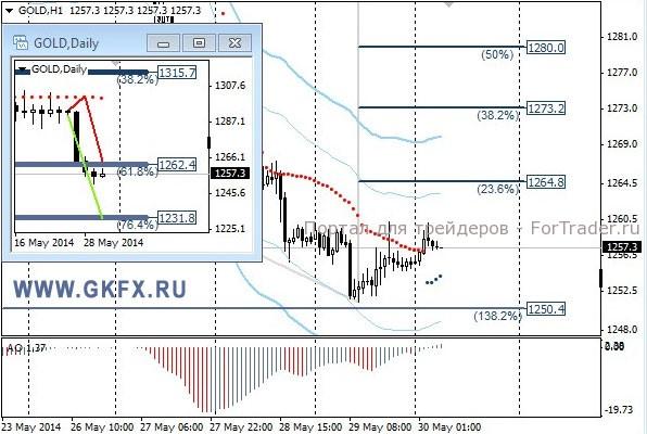 Цены на золото продолжили снижение, немного не достигнув первой цели для открытой сделки на продажу. Безубыток достигнут не был. Продолжаю ожидать дальнейшего снижения. Традиционно делаю два варианта движения цены на неделю, основной красный и альтернативный зеленый. Значимые уровни на сегодня отмечены на часовом графике. Индикатор АО находится у нуля, указывая на неопределенность. Индикатор тренда указывает на рост. Держим продажи от 1261,0 с целями 1250,0, 1240,0 и 1232,0.