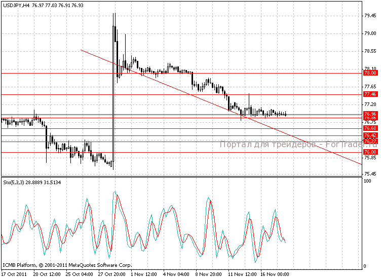 Валютная пара находится в районе 77,00; инвесторы испытывают страх, что в конце недели Банк Японии выйдет с интервенцией, тем более, объем торгов небольшой. Можно ожидать роста по паре к отметке 77,46, если у участников торгов появятся дополнительные интересы к рисковым активам.