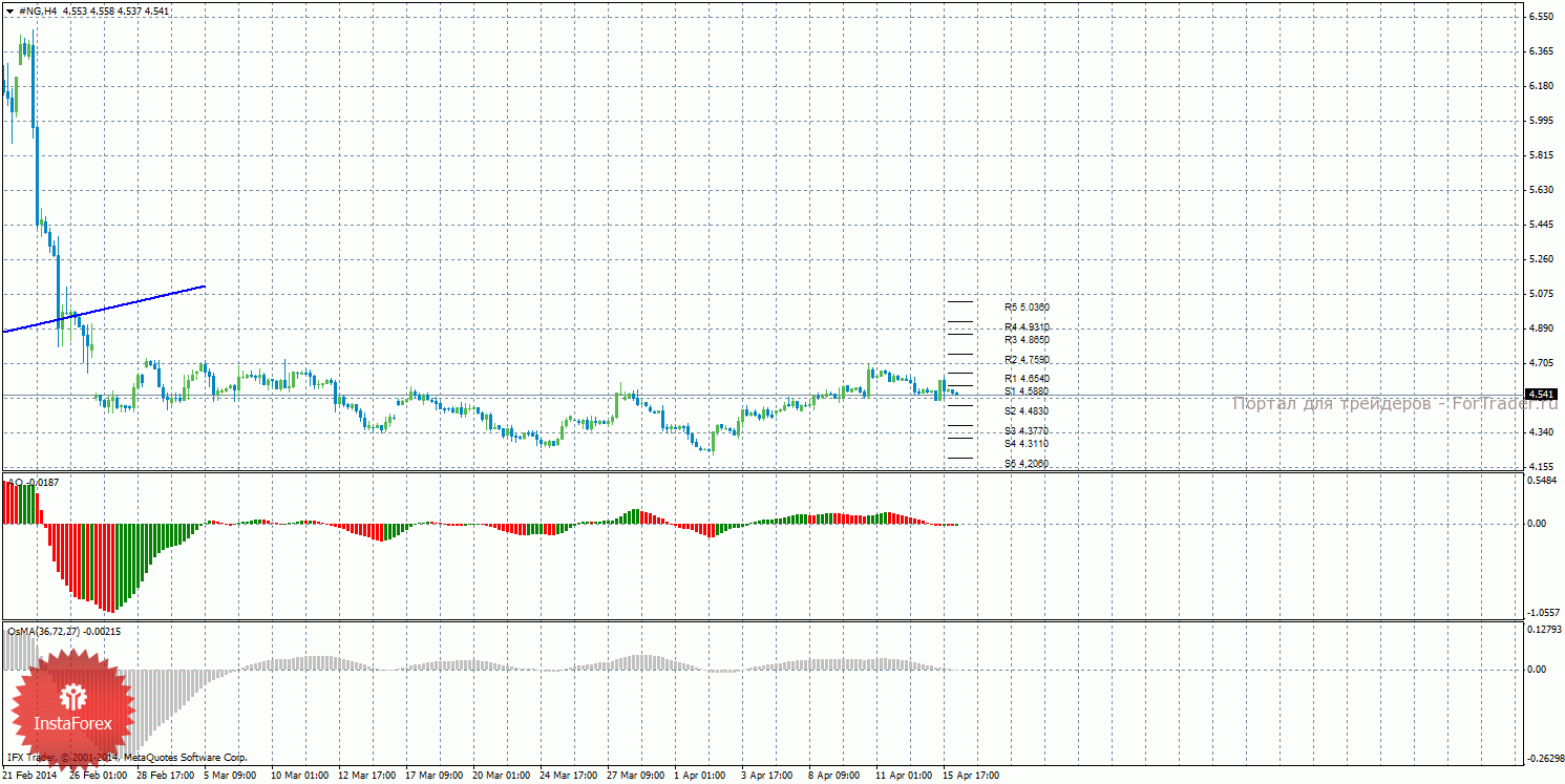 Анализ природного газа за 16 апреля показывает, что цена продолжает слабое движение, сейчас с нисходящим уклоном, оба индикатора по-прежнему находятся около нулевых уровней. На данный момент актуально нисходящее движение с целями уровни поддержки S2 – 4,4830 и S3 – 4,3770, если цена останется ниже уровня 4,5880. Целями для возможного начала восходящей коррекции выступают уровни сопротивления 4,6540 и 4,7590, если цена закрепится выше 4,5880. Цена закрепилась ниже восходящей линии тренда, поэтому она более не актуальна, тенденция на рынке поменялась на нисходящую. Нисходящая линия тренда отсутствует. Индикатор Awesome показывает локальное нисходящее движение, последний закрытый бар окрашен в красный цвет. OsMA также направлен вниз, что сигнализирует о нисходящем движении цены на газ и в более долгосрочной перспективе. Сейчас по-прежнему не самая благоприятная ситуация для открытия позиций.