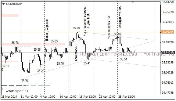 Ситуация на Украине остается напряженной, поэтому укрепление рубля в пятницу будет ограниченно уровнями 35,40 (доллар) и 48,90 (евро). К тому же российский валютный рынок останется низколиквидным до 12 мая, так как все участники вернутся на рынок после 9 мая. Это указывает на то, что волатильность на нашем рынке с сегодняшнего дня возрастет.