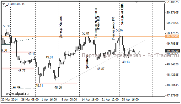 В апреле прогнозируется, что рост занятости вне с/х сектора США составит 200-210 тыс, а уровень безработицы снизится на 0,1%, до 6,6%. Хоть в прошлый раз доллар США показал разнонаправленную динамику против своих конкурентов, сегодня в 16:30 мск по нему ожидается укрепление к основным валютам в пределах 50-70 пунктов. При таком раскладе курс евро и доллара перед выходными днями вырастут по отношению к рублю. На общем фоне роста доллара закрытие по евро/рубль можно ожидать в районе 49,50,доллар/рубль – 35,75.