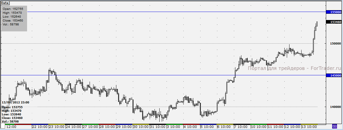 В течение торгового дня четверга основные котировки срочного рынка особо не изменялись: участники торгов были в нерешительности перед выходом важных новостей в США. Однако вечером, благодаря заявлениям Б.Бернанке в отношении расширения программы стимулирующих мер в США, котировки резко пошли вверх. Так, фьючерс на индекс РТС после восьми часов вечера пересек важную отметку 150 000 пунктов и устремился выше. В результате за дневную сессию фьючерс прибавил лишь 0,05%, а за вечернюю –3,43%.