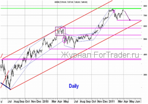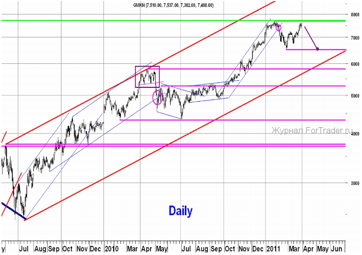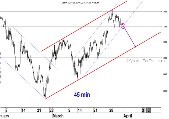На 45-ти минутном графике акция подошла к нижней границе краткосрочного восходящего канала, в котором она повышается уже третью неделю. Если эта граница будет пробита — скорей всего нисходящая коррекция продолжится до нижней границы среднесрочного восходящего канала. Выход вниз из этого канала вероятнее всего будет означать, что в акциях ГМК реализуется фигура технического анализа «Двойная вершина» и скорей всего мы увидим снижение к минимуму этого года 6 511 р. Благоприятный для быков сценарий может реализоваться только в случае обновления исторического максимума 7 723 р.