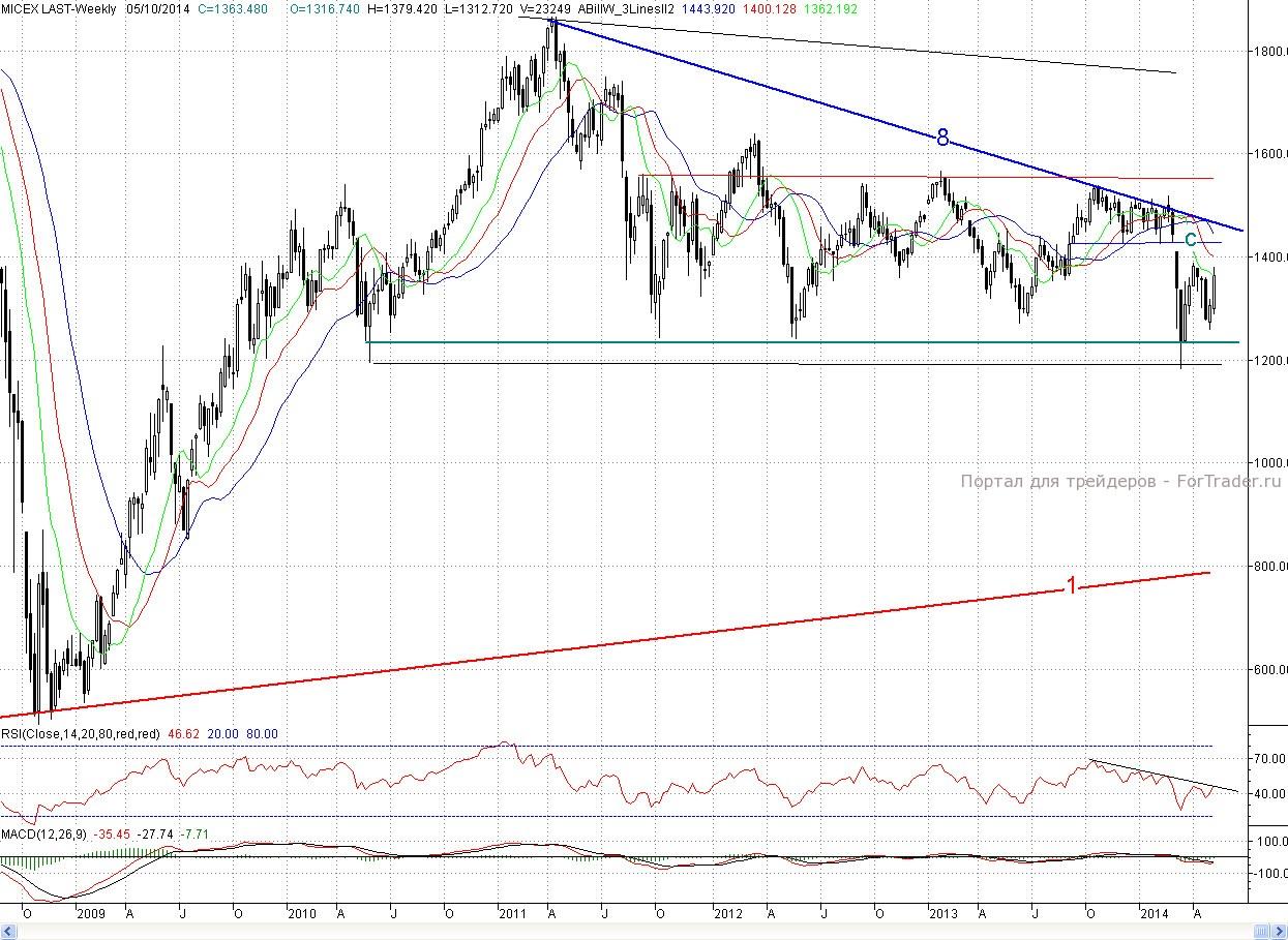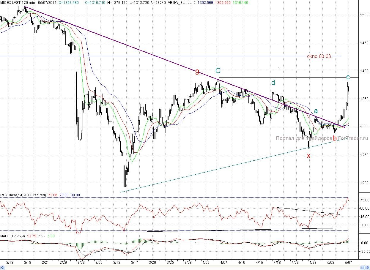 С технической точки зрения плюсом для игроков на повышение является то, что индекс ММВБ и по дням вошел в покупку. При этом на 2- часовом графике медвежьи дивергенции отсутствуют. Однако, несмотря на такой впечатляющий рост, полноценного разворота по дням не произошло, так как пока не взят апрельский максимум С (1 388 п.), да и кривые MACDа все еще находятся на отрицательной территории. К тому же рост с конца апреля медведи могут рассматривать и как коррекционный в виде трехволновки (a-b-c). При этом длина подволны с идет с расширением 1,62 от длины подволны a с целью роста ~ 1 385п. Так что апрельский максимум С (1 388 п.), может стать и потолком для бычьего наступления.