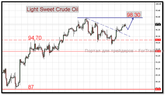 По нашим оценкам, текущий тренд фьючерсов Light Sweet указывает на скорое достижение максимумов 23 августа 98,30$, прорыв выше которых автоматически открывает путь к рубежу 100$ за баррель. Что касается нефти сорта Brent, то ее устойчивый рост на протяжении 2-х последних торговых сессий указывает на полную решимость быков вернуться к уровням апреля 120$. В качестве промежуточной цели для восходящего ралли выступает отметка 118$.