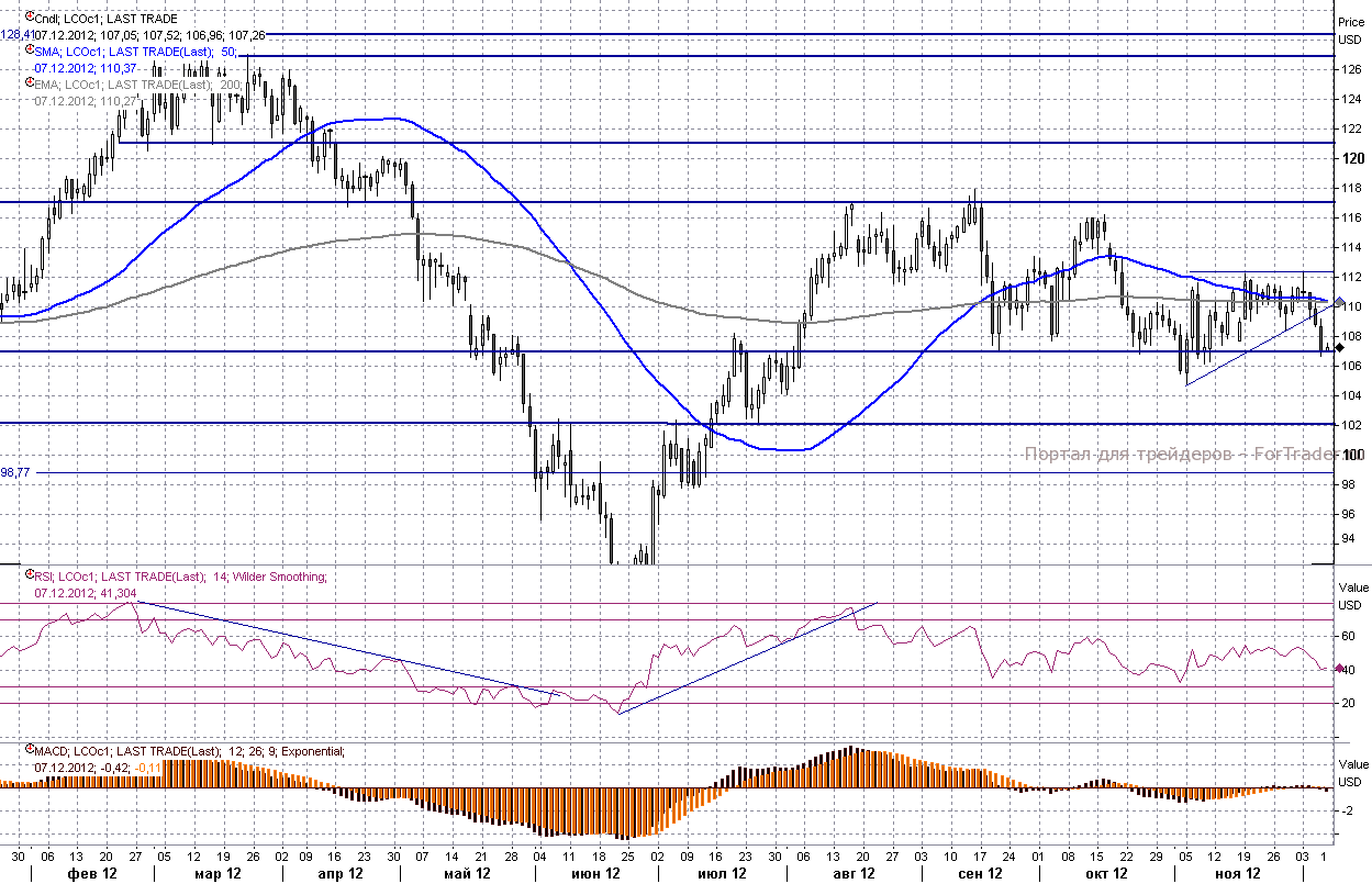 В то же время сохраняются опасения по поводу проблемы бюджетного обрыва в США, где Конгресс и Белый дом не могут договориться о размерах сокращения бюджетных расходов и повышении налогов. Не исключено, что эта избитая история будет оказывать давление на рынок весь декабрь, если конечно компромисс не будет найден заранее. При отсутствии договоренности между Белым домом и Конгрессом могут возникнуть большие трудности в плане того, чтобы страна избежала нового периода рецессии.