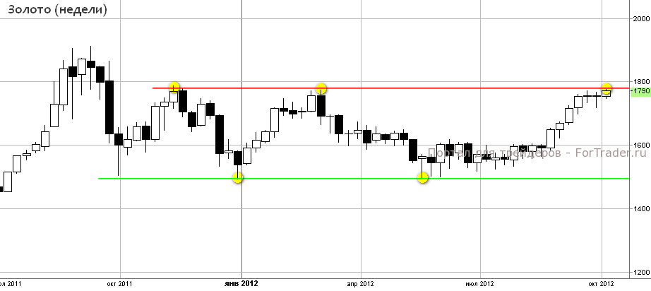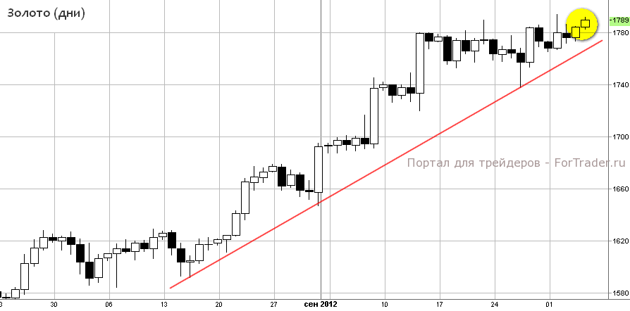 Соответствено, перед тем как сегодня Банк Англии и ЕЦБ объявят свои решения по ставкам, участники торгов вспомнили последние действия мировых ЦБ в сентябре: ЕЦБ принял решение проводить неограниченный выкуп облигаций, Банк Японии расширил программу выкупа активов, ФРС запустила QE3, НБК «влил» в финансовый сектор миллиарды долларов. Эти меры, в совокупности с давлением европроблем на фондовые индексы, привели к тому, что цены на золото достигли ключевого уровня сопротивления $1790+ за унцию.
