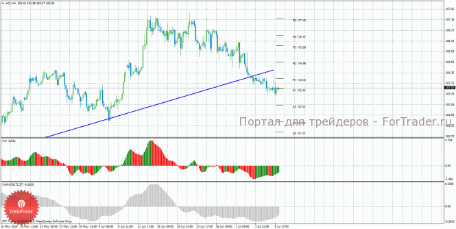 Анализ сырой нефти за 9 июля показывает, что цена продолжает нисходящее движение, но закрепилась выше уровня S1, поэтому может начаться коррекция. Нисходящее движение может возобновиться с целями S2 – 102,52 и S3 – 101,59, если цена закрепится ниже уровня 103,45. Целями для начала восходящей коррекции выступают уровни сопротивления 104,03 и 104,96, если цена останется выше уровня 103,45. Восходящая линия больше не поддерживает торгующих на повышение, цена закрепилась ниже нее, поэтому сейчас актуальны короткие позиции. Индикатор Awesome показывает текущее восходящее движение, так как последний закрытый бар зеленого цвета. OsMA также направлен наверх, что говорит о восходящем характере движения и в более долгосрочном плане. Если цена закрепится ниже уровня 103,45, это может спровоцировать возобновление нисходящего движения.