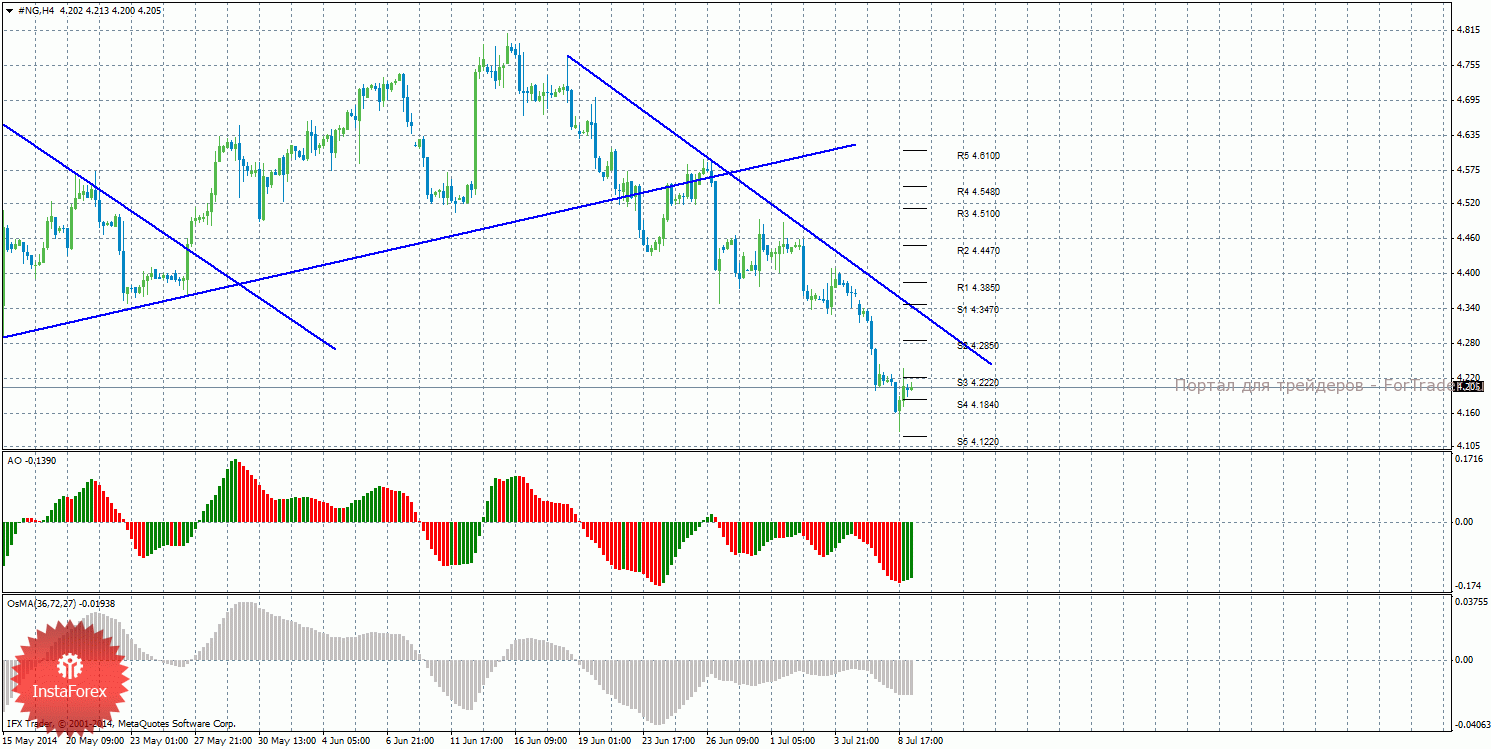 Анализ природного газа за 9 июля показывает, что цена начала виток коррекционного движения, о чем просигнализировали развороты обоих индикаторов наверх. На данный момент актуально нисходящее движение с целями уровни поддержки S4 – 4,1840 и S5 – 4,1220, если цена останется ниже уровня 4,2220. Целями для продолжения восходящей коррекции выступают уровни 4,2850 и 4,3470, если цена закрепится выше уровня 4,2220. Построена новая нисходящая линия тренда, которая оказывает поддержку торгующим на понижение и делает актуальными ордера на продажу. Индикатор Awesome показывает локальное восходящее движение, последний закрытый бар окрашен в зеленый цвет. OsMA также развернулся наверх, что сигнализирует о восходящем движении цены на газ и в более долгосрочной перспективе. Отскок цены от уровня 4,2220 может спровоцировать завершение коррекции.