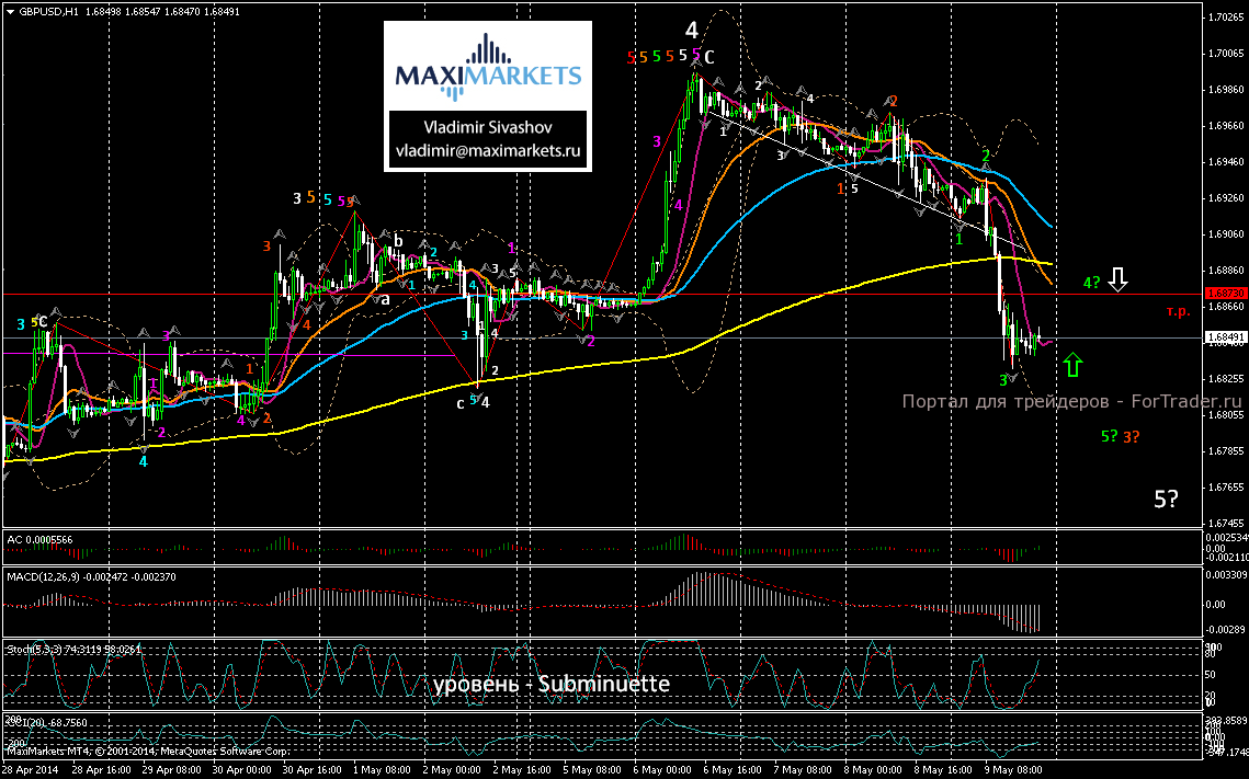 В нашем прогнозе на сегодня предполагаем завершение текущего коррекционного подъёма пары в ценовой зоне 1.6873 ÷ 1.6888, а затем возобновление нисходящего движения курса британской валюты к целевым уровням 1.6832, 1.68, 1.6770.