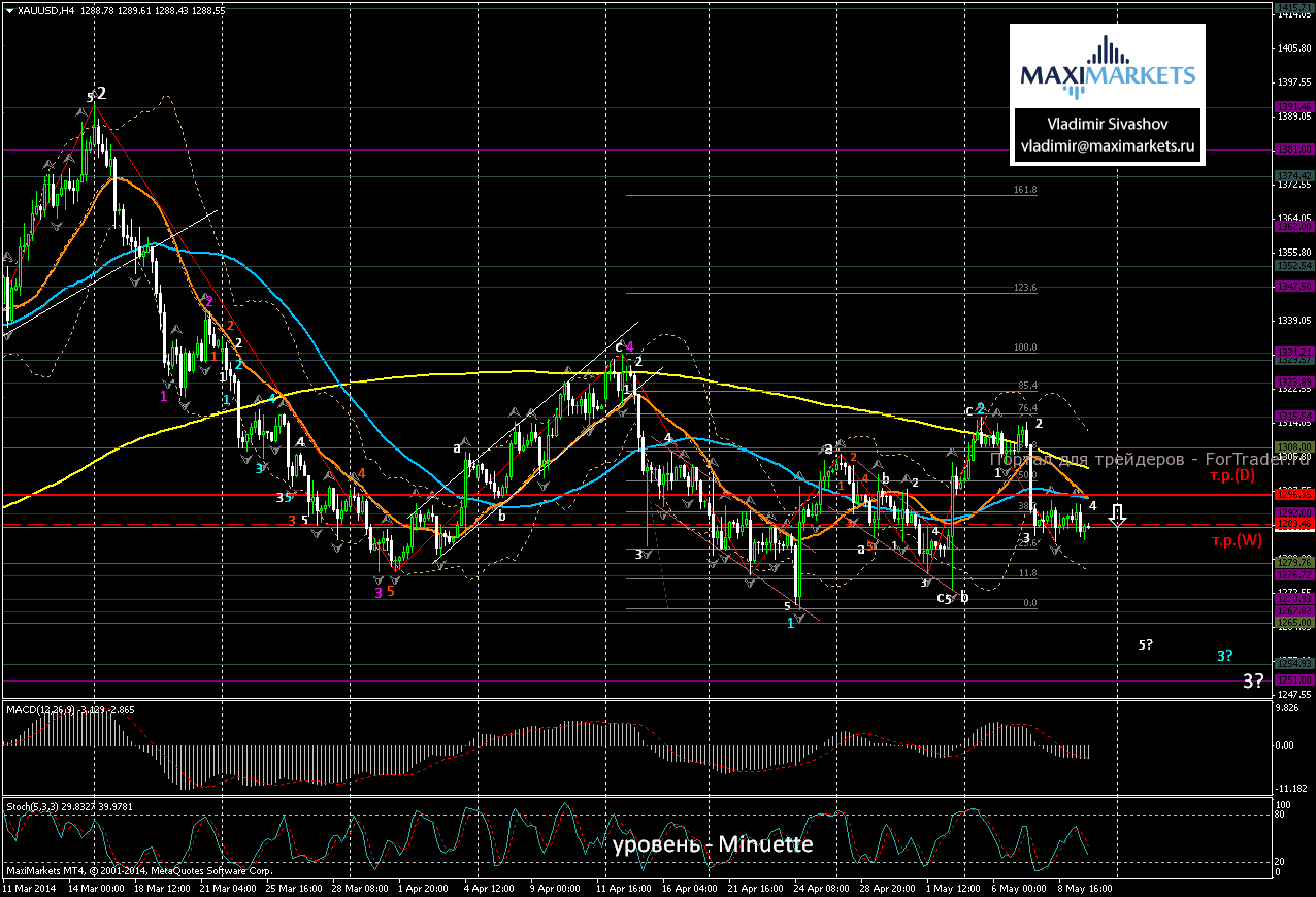 В качестве приоритетного направления ценовой динамики золота на сегодня предполагаем первоначально боковое движение металла в диапазоне 1293$ ÷ 1285$ за унцию. Затем — пробой нижней границы и снижение котировок к вышеназванным целевым уровням поддержек.