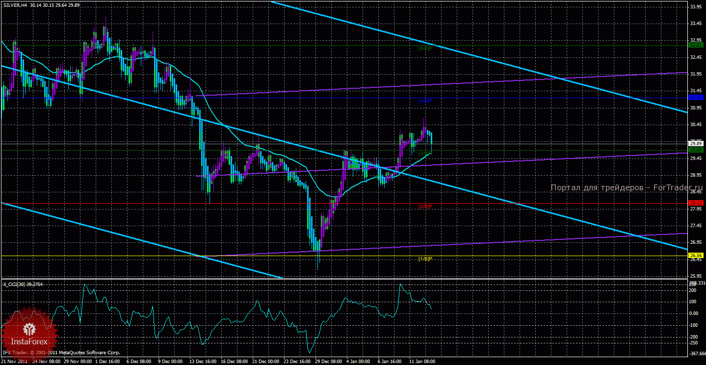 Исходя из анализа серебра 13 января видно, что курс продолжает восходящее движение и за вчерашний день младший канал линейном регрессии развернулся наверх, что позволяет нам торговать на повышение. Старший канал направлен вниз, что свидетельствует о нисходящем направлении движения глобального тренда. Младший канал направлен вверх, что означает восходящее движение в менее долгосрочном плане. Сейчас цена находится выше мувинга и выше уровня Мюррея «3/8», что делает актуальным восходящее движение. Первой целью восходящего движения является уровень Мюррея «4/8» — 31,25 и торговать на повышение с этой целью уже можно. В случае преодоления первого целевого уровня, восходящее движение продолжиться с целью «5/8» — 32,81. Скользящая средняя направлена вверх, а цена в свою очередь находится выше нее, что сигнализирует о текущем восходящем движении. Короткие позиции можно будет рассматривать только после закрепления цены ниже мувинга. Хайкен Аши окрасил несколько баров в голубой цвет, что сигнализирует о локальном нисходящем движении, поэтому открывать новые лонги можно будет после окончания текущей коррекции. Индикатор CCI находится около уровня 0, что свидетельствует об отсутствии какой-либо перекупленности или перепроданности курса серебра.