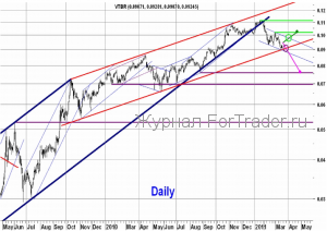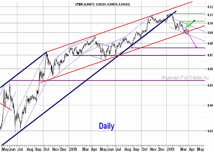 В начале февраля котировки ВТБ окончательно пробили нижнюю границу долгосрочного восходящего канала. Несмотря на то, что с июля прошлого года она несколько раз была «проткнута» вниз, далеко от неё рынок не уходил, периодически обновляя годовые максимумы. В конце января был установлен новый трёхлетний максимум 0.1114 р., после чего акция развернулась вниз. На этой неделе, в понедельник акции ВТБ пробили отметку 0.09 р. и достигли нижней границы среднесрочного восходящего канала, в котором они повышались с начала 2010 г., после чего произошёл отскок вверх.
