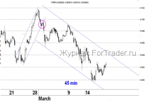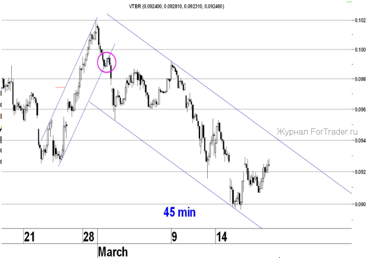 На 45-ти минутном графике акция всё ещё находится в краткосрочном нисходящем канале. Если этот канал будет пробит вверх — это будет первым сигналом к началу более высокой восходящей коррекции, в таком случае скорей всего она продолжится до верхней границы краткосрочного нисходящего канала на дневном графике. Пробой этой границы вероятнее всего приведёт к дальнейшему росту до горизонтального сопротивления 0.1020 р. Если же нижняя граница среднесрочного восходящего канала на дневном графике будет пробита вниз, скорей всего мы увидим снижение до горизонтальной поддержки 0.076 р.