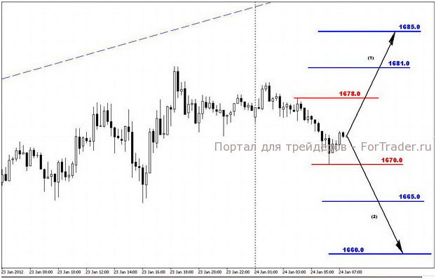 Из значимой макроэкономической статистики, запланированной на сегодня, следует лишь отметить релиз предварительных данных по композитному индексу PMI и индексу PMI для производственного сектора еврозоны за январь. Ожидается, что большая часть этой статистики выйдет позитивной, что может поддержать котировки золота. Предполагаемый диапазон изменения стоимости золота во вторник может стать 1665,0 – 1681,0 долларов США за тройскую унцию.