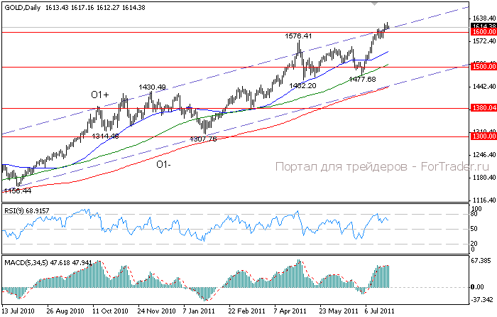 Однако металл смог удержаться выше отметки 1600.00 долларов за унцию. На рынке наблюдалась некоторая фиксация прибыли, связанная с истечение срока опционных контрактов, а также с укреплением доллара США, рост которого был спровоцирован жесткими комментариями министра финансов Германии Шойбле о том, что европейский долговой кризис не был разрешен на прошлой неделе, несмотря на получение Грецией второго пакета помощи. Это заставило инвесторов на некоторое время отвлечься от проблемы госдолга США и сосредоточиться на проблемах еврозоны, спровоцировав таким образов укрепление доллара США против евро, а также других рискованных валют. Подобная динамика негативно отразилась на золоте, однако котировки удержались выше отметки 1600.00 долларов, поскольку неопределенность относительно повышения потолка госдолга США продолжает оказывать поддержку. Для многих инвесторов золото остается практически единственной альтернативой в случае дефолта по долгу США, так как оно менее уязвимо перед лицом потрясений на рынке, чем акции или облигации.