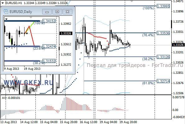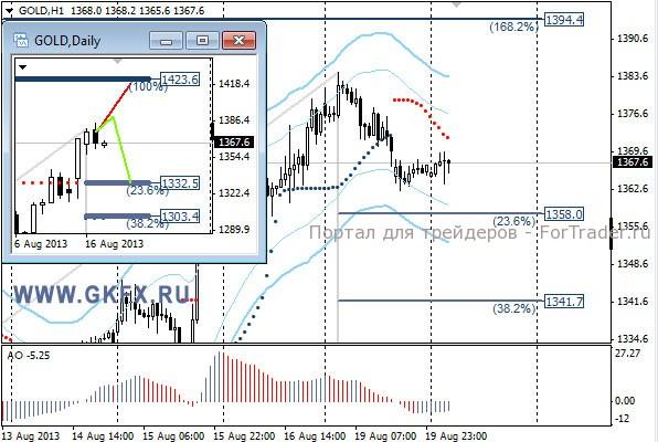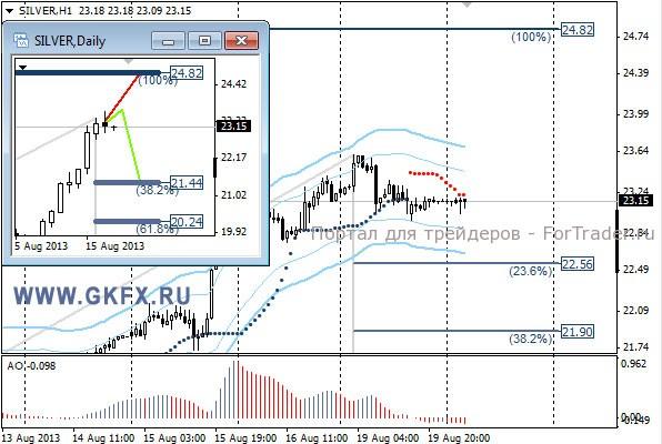 Цены на золото консолидировались в ожидании важнейшего события этой недели для драгметаллов публикации протоколов последнего заседания ФРС США, которые прольют свет на намерения членов ФРС США в отношении сокращения программы стимулирования QE3. Сегодняшняя динамика будет схожа предположительно в диапазоне 1360-1380,0. Вероятен также рост до 1400,0. Традиционно делаю два варианта движения цены на неделю, основной красный и альтернативный зеленый. Значимые уровни на сегодня отмечены на часовом графике. Индикатор АО находится в отрицательной зоне и растет, указывая на коррекцию перед возможным продолжением снижения. Индикатор тренда указывает на снижение. Вне рынка.